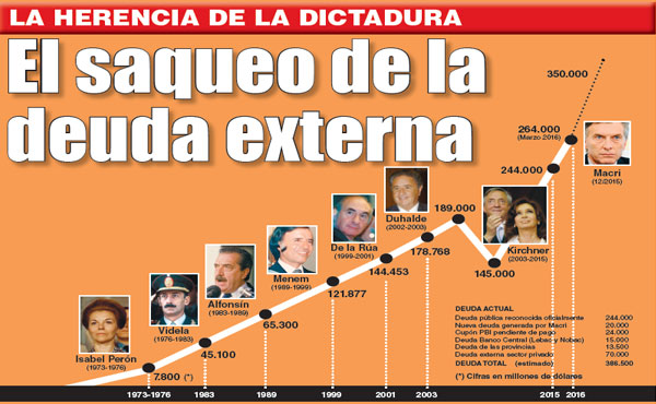 Durante la última dictadura cívico-militar, la deuda externa total de la Argentina, pública más privada, pasó de 8.085 millones de dólares en 1975 a 45.903 millones de dólares en 1983. Del 18,9% del PBI pasó al 60% del PBI. En tanto, en ese mismo período, la deuda pública externa se sextuplicó: era de 5.000 millones y trepó a 32.000 millones de dólares. De estos últimos, 23.000 millones de dólares se originaron en la estatización de la deuda externa privada que benefició a más de 70 grandes empresas.